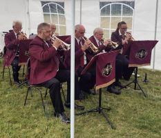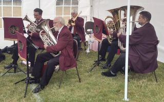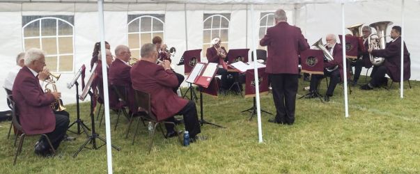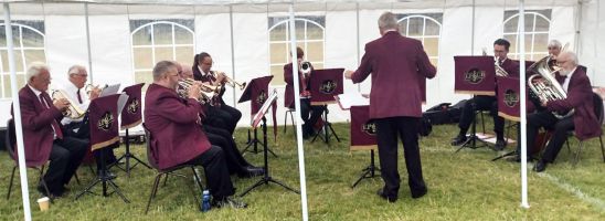 The marquee gave us some shelter from the showers although our long-suffering musical director managed to get a bit damp from water running off the top of the marquee. The breeze gave it the effect of someone intermittently throwing small buckets of water over him. Also, to ensure that he was evenly damp all over, he walked backwards and forwards through the showers to introduce each piece to our audience.