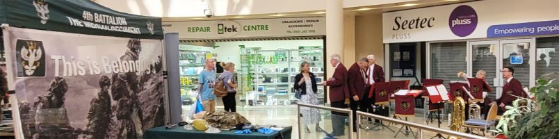 On Saturday 24th June, Armed Forces Day, we supported The 4th Battalion of The Mercian Regiment, their reserve Battalion, with their display at Ellesmere Port’s Arcades. Click on the image of soldiers and the pavilion to learn more about them. (You can just see us in the background on the left of this picture).