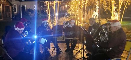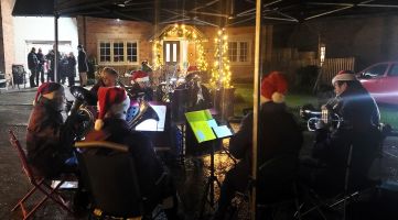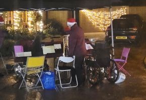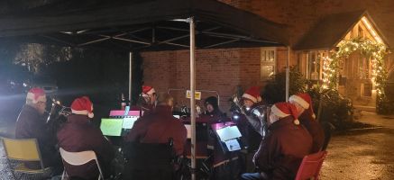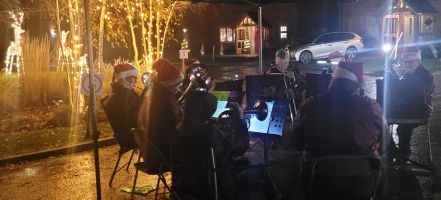 The Pulford Residents association invited us back again to add atmosphere to the turning on of their lights. We were made very welcome, a pergola was supplied for us to play under just in case it rained, and we had a very pleasant evening. Wine, tea, sausage rolls, and pork pies were supplied to warm us up after playing on a cold and damp evening.