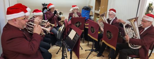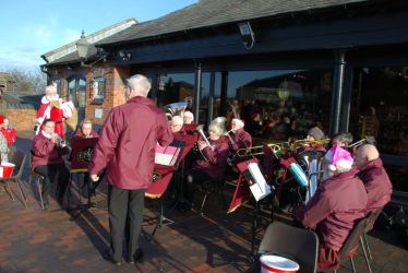 December is a month mapped out for carolling. The activities range from Carol Concerts both at churches and in Nursing and Retirement Homes to rattling collecting tins outside various venues. In the slide show you can see us playing at The National Waterways Museum where they have a barge which brings Santa to the Visitors Restaurant and then takes people on a canal cruise - Our job is to play as Santa arrives and play again to welcome them when they return from the cruise - in between we warm up with tea and coffee in the restaurant. You also see a couple of images of us in Gordale Garden Centre playing for the launch of their Christmas period and playing outside Marks and Spencer in the Cheshire Oaks retail park - two of our regular Christmas venues.