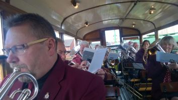In 2015 The Merseyside Tram Preservation Society had restored tram 245 and to assist in it's launch we provided a fanfare as it left the tram shed and then played a selection of marches on top of a tram as it traveled from the shed to Birkenhead's Woodside Ferry. If you click on the Band On a Tram image you can see and hear us playing the fanfare as the tram left the shed and then get a pedestrian's ear view of us playing while the tram passes by.